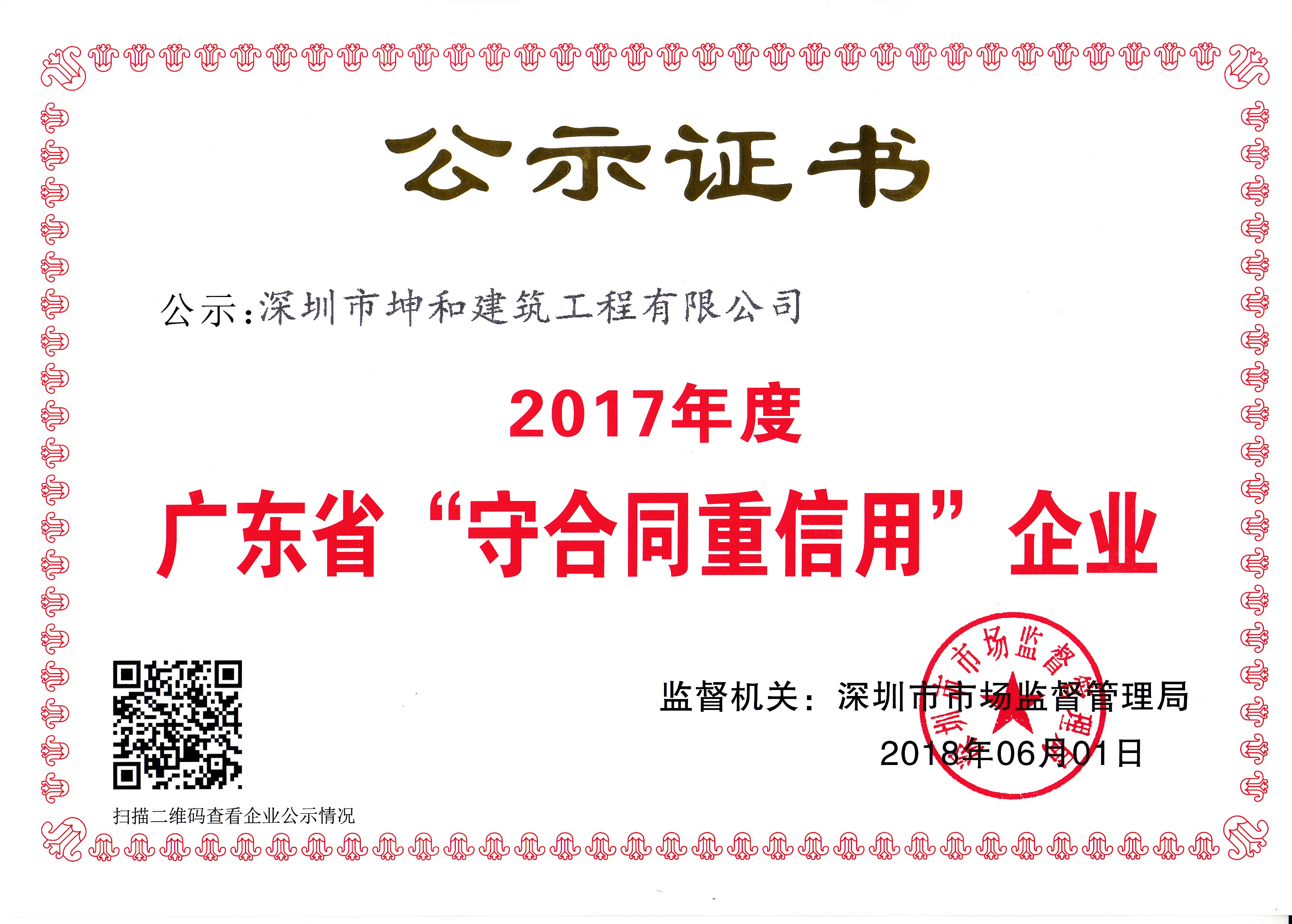 中華沃土,德載萬物;時代滄桑,神州巨變;改革的車輪,滾滾向前,印證了深圳光輝之歷程。坤和公司隨著深圳的建設與發展,逐步發展成為擁有集房產開發,建筑施工、設計、裝飾裝修及勞動服務等多項專業于一體的現代建筑企業。 經營之道,貴在誠信,興衰之理,系乎一變。坤和公司今天的成就,得益于我們始終堅持“安全第一,質量第一,信譽第一,用戶第一”的經營理念,認真貫徹“質量責任重于泰山,顧客滿意高于一切”的方針,