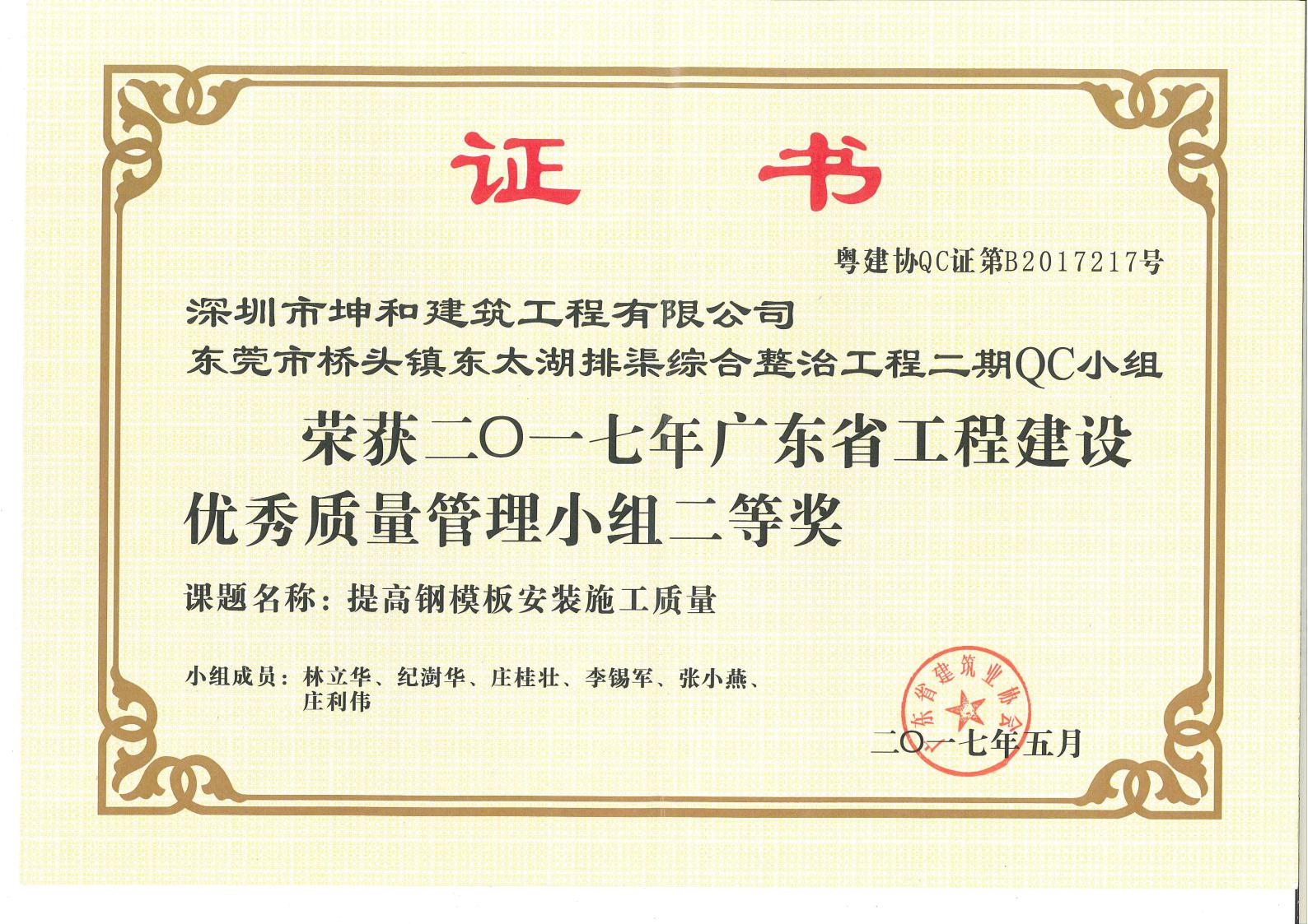 深圳市坤和建筑工程有限公司于二00五年十一月廿八日成立,經過全體員工的共同努力,公司發展迅速,目前公司注冊資金為12010萬元,是一支具有房屋建筑工程施工總承包一級;市政公用工程施工總承包一級;水利水電工程施工總承包二級;地基基礎工程專業承包二級;建筑裝修裝飾工程專業承包二級;建筑機電安裝工程專業承包三級;鋼結構工程專業承包三級資質的專業施工隊伍,并于二00六年通過了ISO9001:2008標準﹑ISO14001:2004標準﹑GT/B2800-2001標準三項管理體系認證。 公司目前擁有各類專業技術人員351人。建筑工程、市政公用工程、水利水電工程、機電工程等各專業注冊建造師99人,注冊造價師5人,高級技術職稱20人,中、初級工程技術職稱和經濟、財會系列的專業人員331人。同時公司設備精良,擁有各類大型工程機械設備391臺,總功率達9600kw以上,這些設備為承接各類工程,確保高效、優質、安全施工奠定了堅實的基礎,是一家擁有全方位施工能力的建筑施工企業。公司多次獲得上級部門的表揚和嘉獎。 公司內部實行計算機智能化管理,建立了一套完善的質量、安全管理體系和制度。嚴格遵守國家規定的各類法律和各項規章制度,積極貫徹以“安全生產、文明施工”為主的生產作業指導方針;始終遵循“質